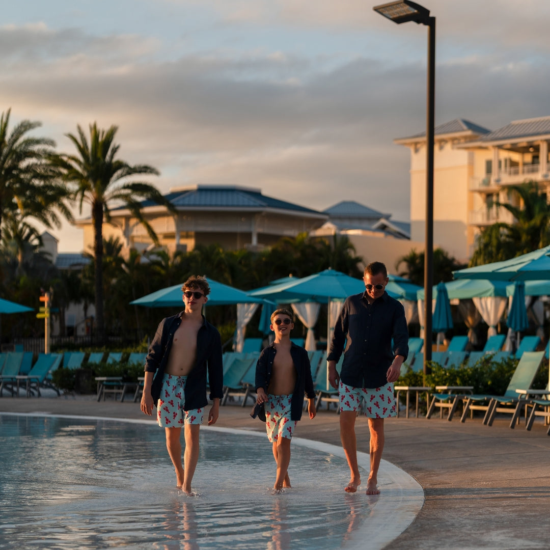We’ve taken a curvy lobster motif and colored it with pastel blue and a punchy berry pink to create these charming trunks that are perfect for men and boys. Match up with the little guy and wear them in or out of the water for a fun and fresh look. The elasticated waistband and adjustable drawcord make these ultra-comfortable, wear-all-day shorts.