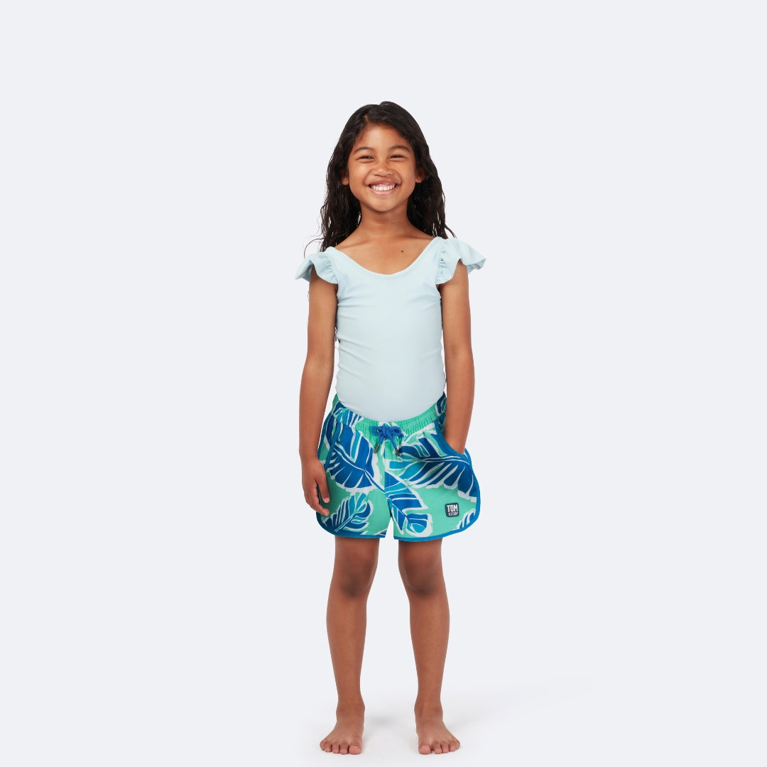 Our tropical banana-leaf print board shorts will add a fresh, fun twist to your best girl’s beach kit. Featuring a bold blue leaf design on a vibrant green background, these sporty shorts are crafted from super-soft, UV50+ recycled-blend fabric for all-day comfort and sun protection. The lightweight, quick-dry material and flexible fit make them perfect for running, splashing, and every adventure in between. Pair them with a navy or white one-piece for an effortlessly cool swim look.